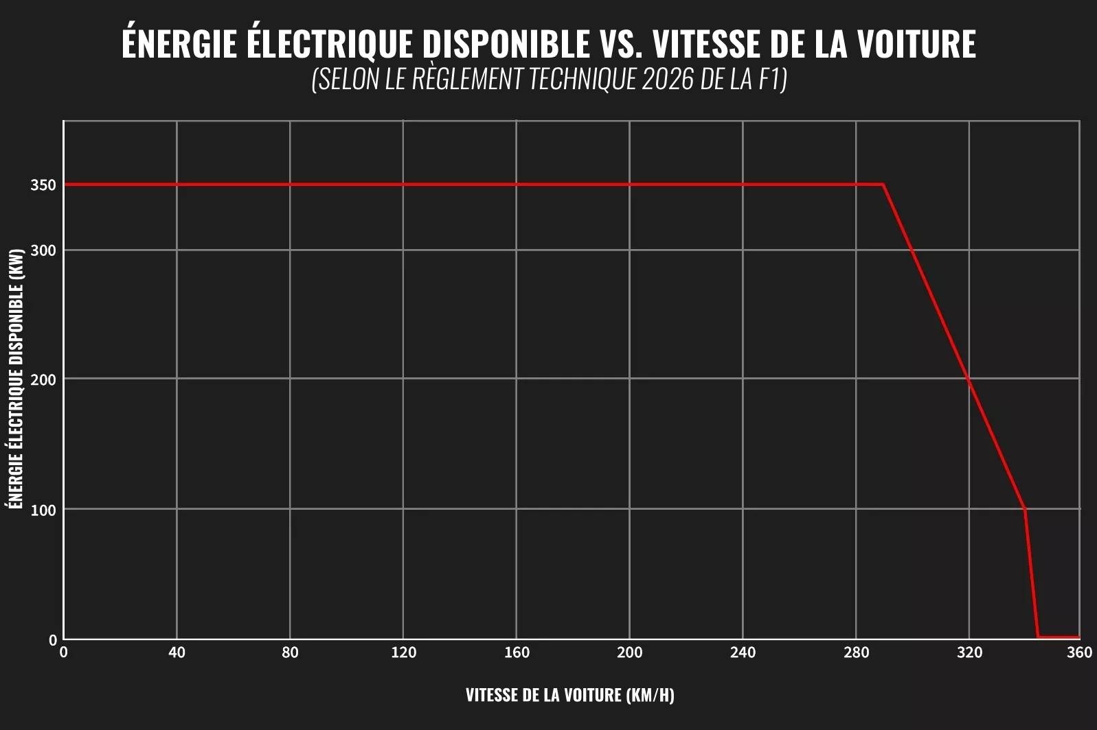 Le mode "override" de l'année prochaine sera intéressant à observer. Au-delà de 290 km/h, la partie électrique du moteur, alimentée par le MGU-K (qui récupérera l'énergie du freinage), commencera à réduire sa puissance maximale de 350 kW à un rythme tel qu'elle tombera à zéro lorsque la voiture atteindra 345 km/h, comme le montre le graphique ci-dessous.