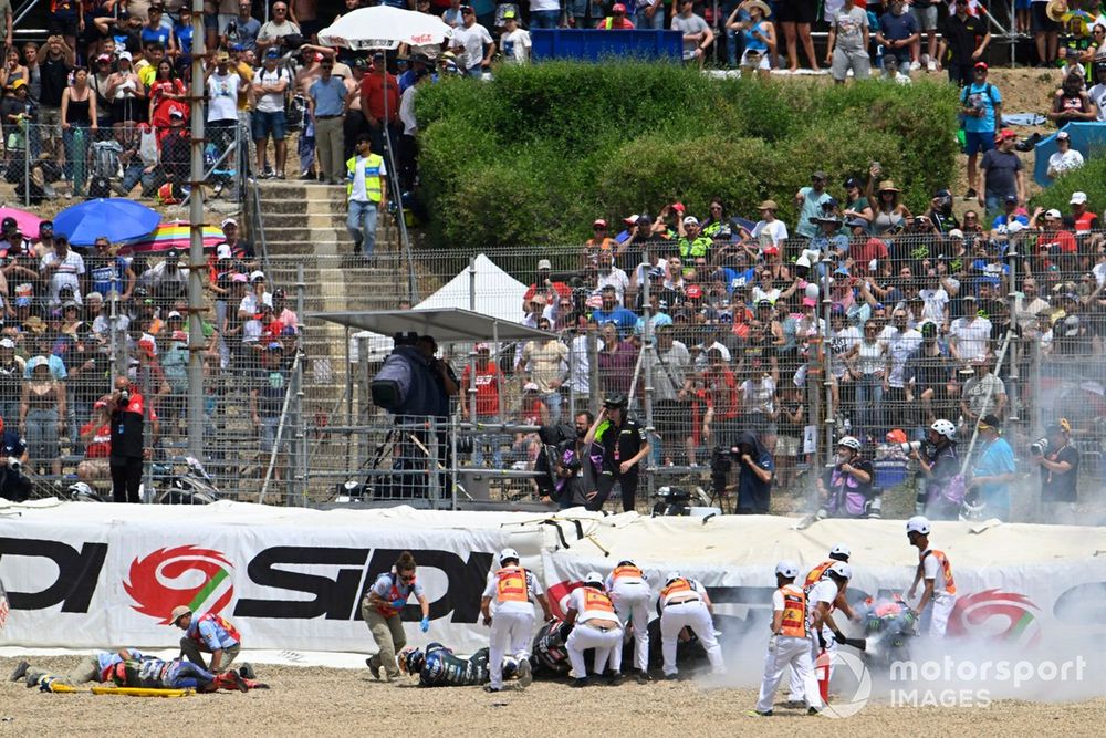 Si le pilote VR46 a réussi à rester sur ses roues, Quartararo est tombé, entraînant avec lui Oliveira. Le pilote Yamaha s'est assez rapidement remis sur pied, bien qu'il ait semblé être boitillant, visiblement avec un pied droit endolori. Oliveira, quant à lui, a été évacué sur civière et emmené en ambulance vers le centre médical. Conscient, il semblait souffrir du bras gauche.
